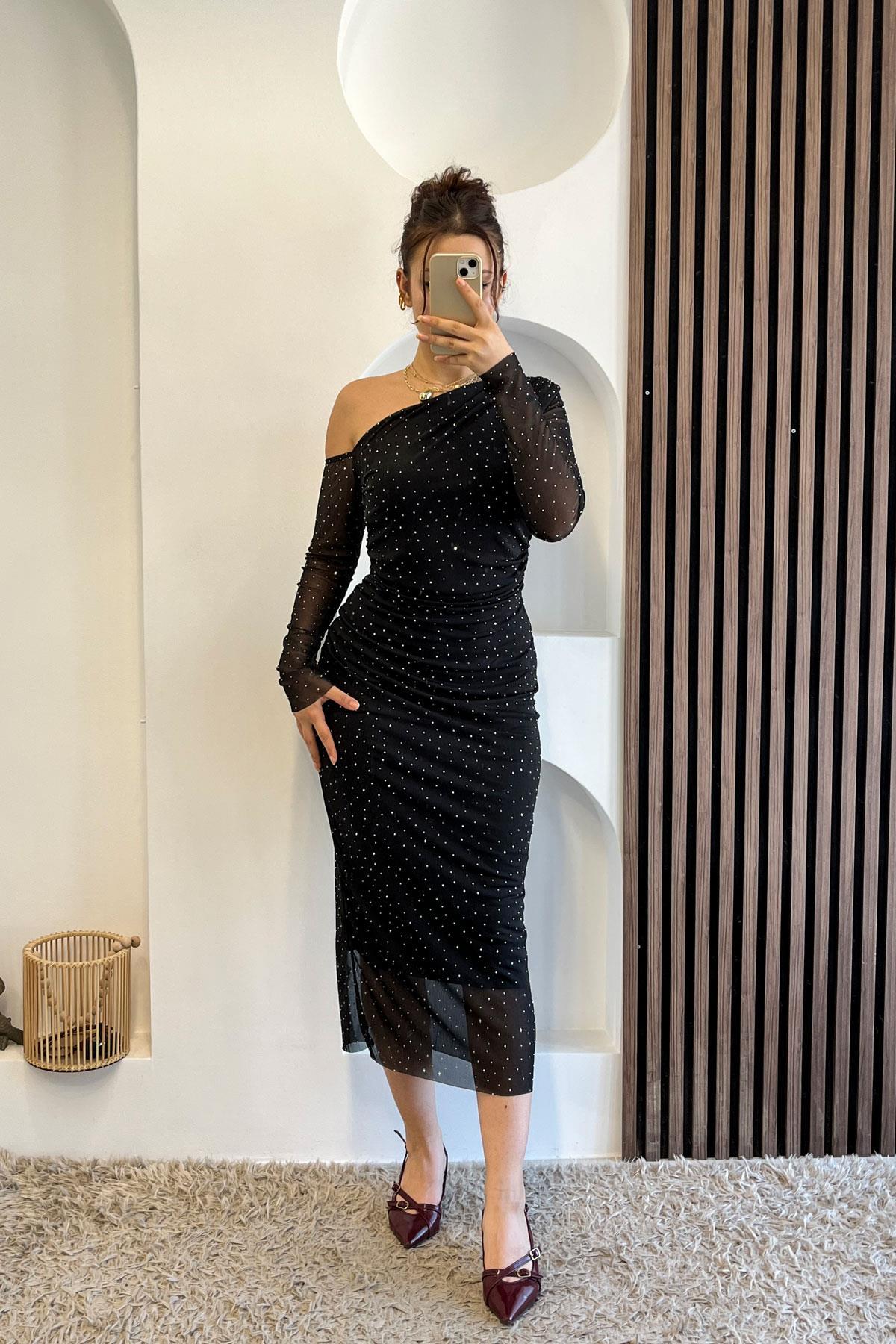 Asimetrik Yaka Tül Taşlı Elbise-Siyah