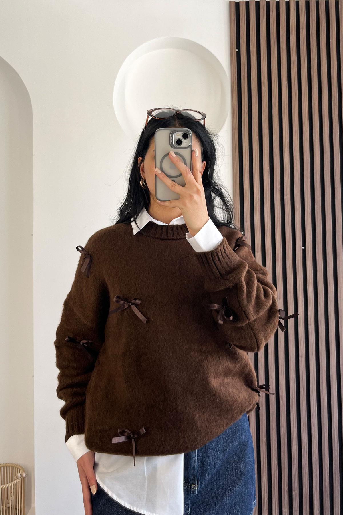 Biisklet Yaka Fiyonk Detay Triko Kazak-Kahve