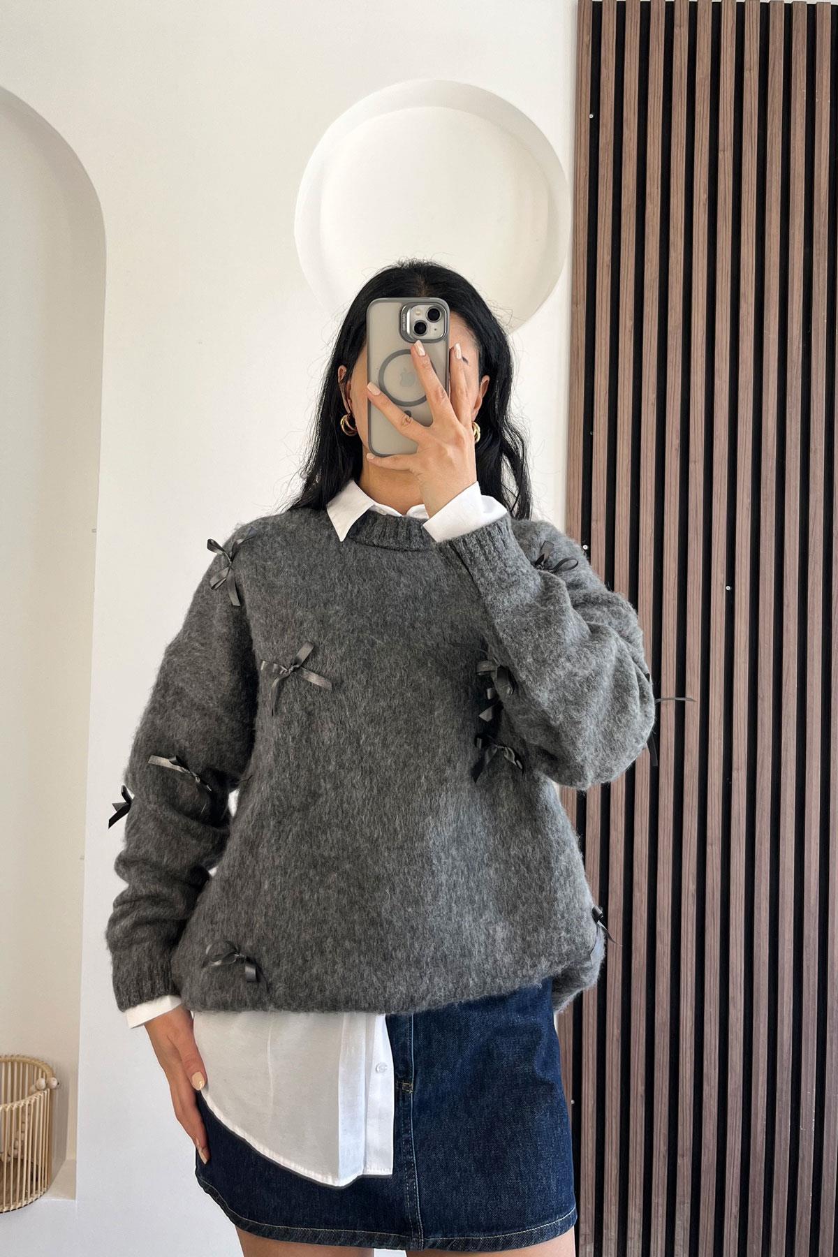 Bisiklet Yaka Fiyonk Detay Triko Kazak-Antrasit