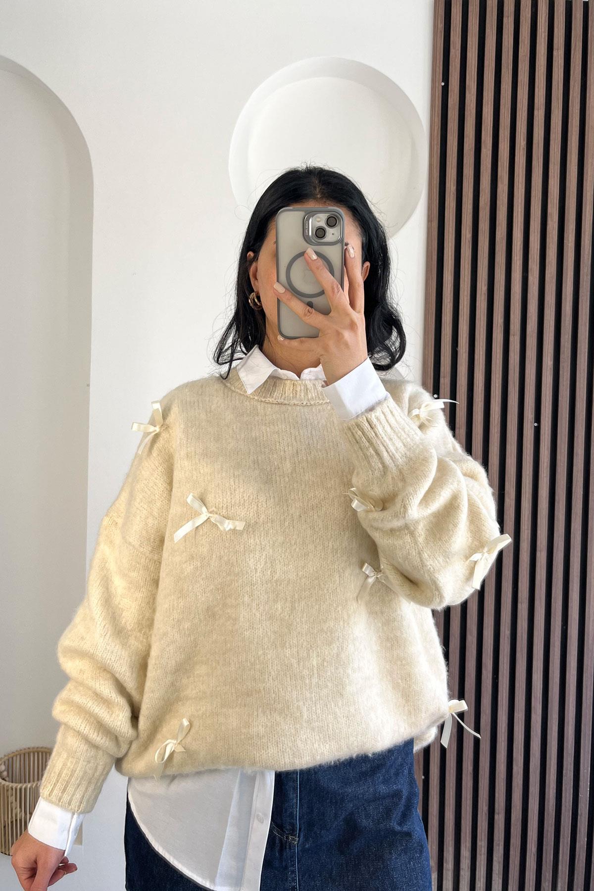 Bisiklet Yaka Fiyonk Detay Triko Kazak-Krem
