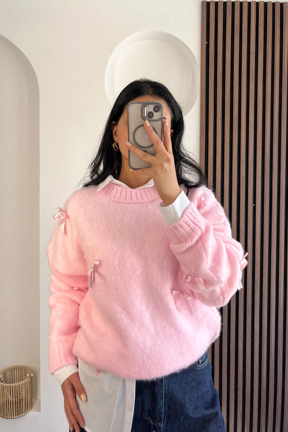 Bisiklet Yaka Fiyonk Detay Triko Kazak-Pembe