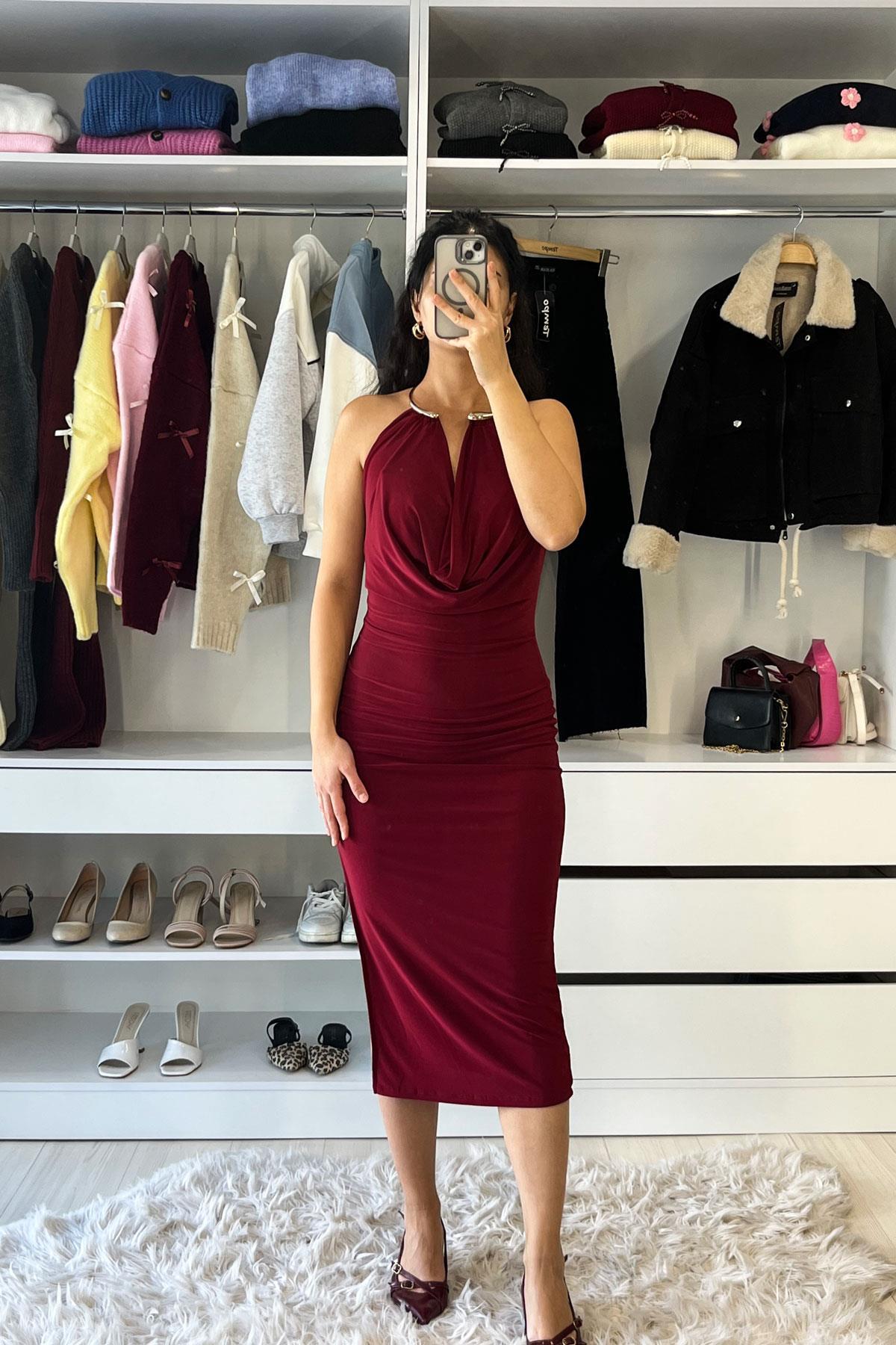 Boyundan Ay Aksesuar Sandy Elbise - Bordo