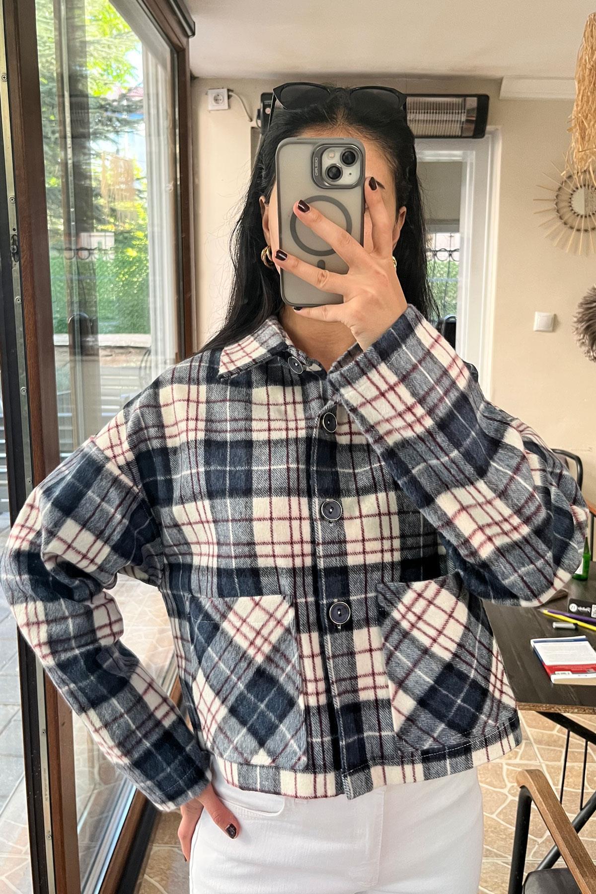 Ekose Desen Crop Kaşe Gömlek - Mavi