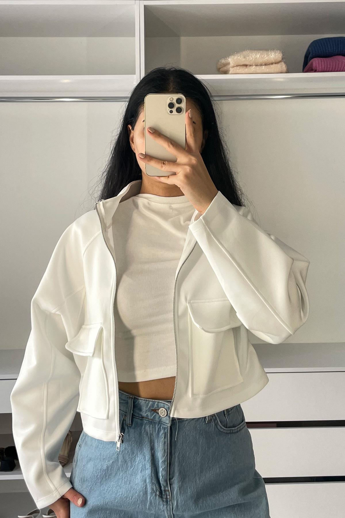 Kapaklı Cep Detay Fermuarlı Ceket - Ekru