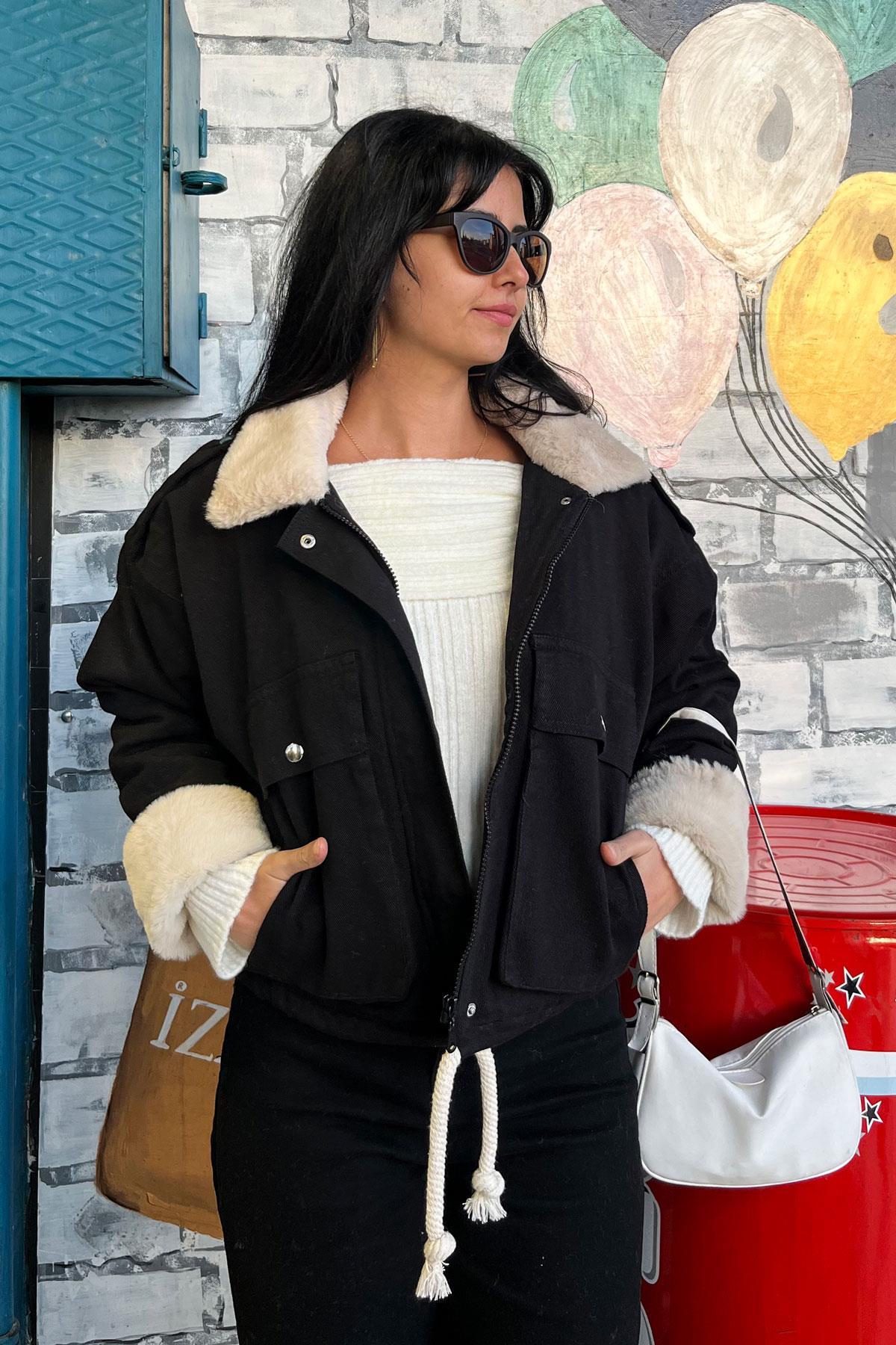 Omuz Apoletli Peluş Detay Kot Mont - Siyah