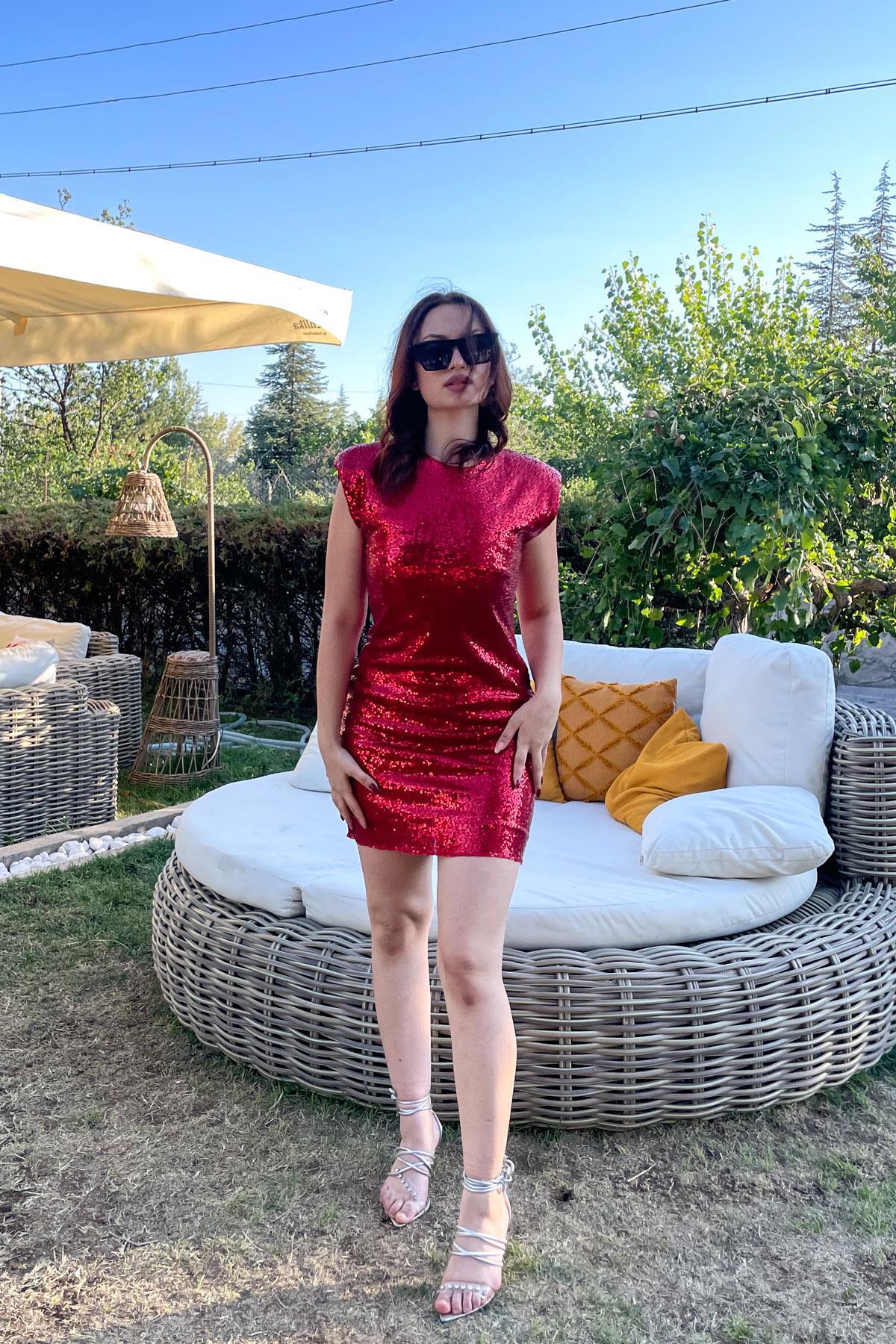 Omuz Vatkalı Arka Derin Yırtmaçlı Pullu Elbise - Kırmızı