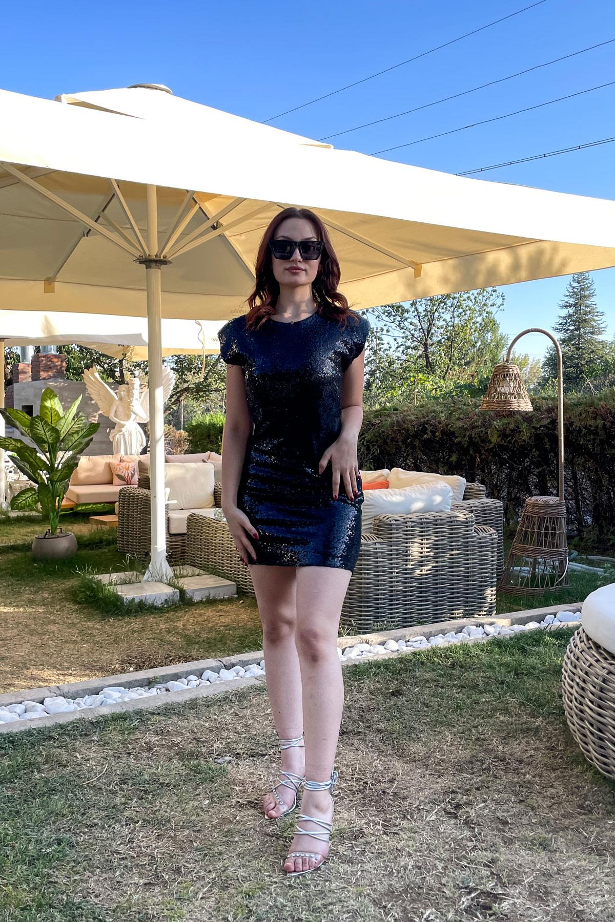 Omuz Vatkalı Arka Derin Yırtmaçlı Pullu Elbise - Siyah