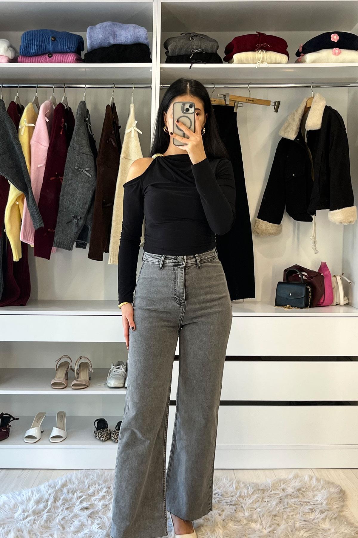 Ön Cepsiz Paça Kesimli Bol Paça Jean - Gri