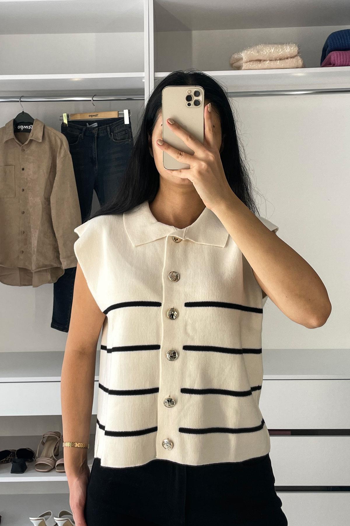 Polo Yaka Gold Düğmeli Çizgili Yelek-Ekru