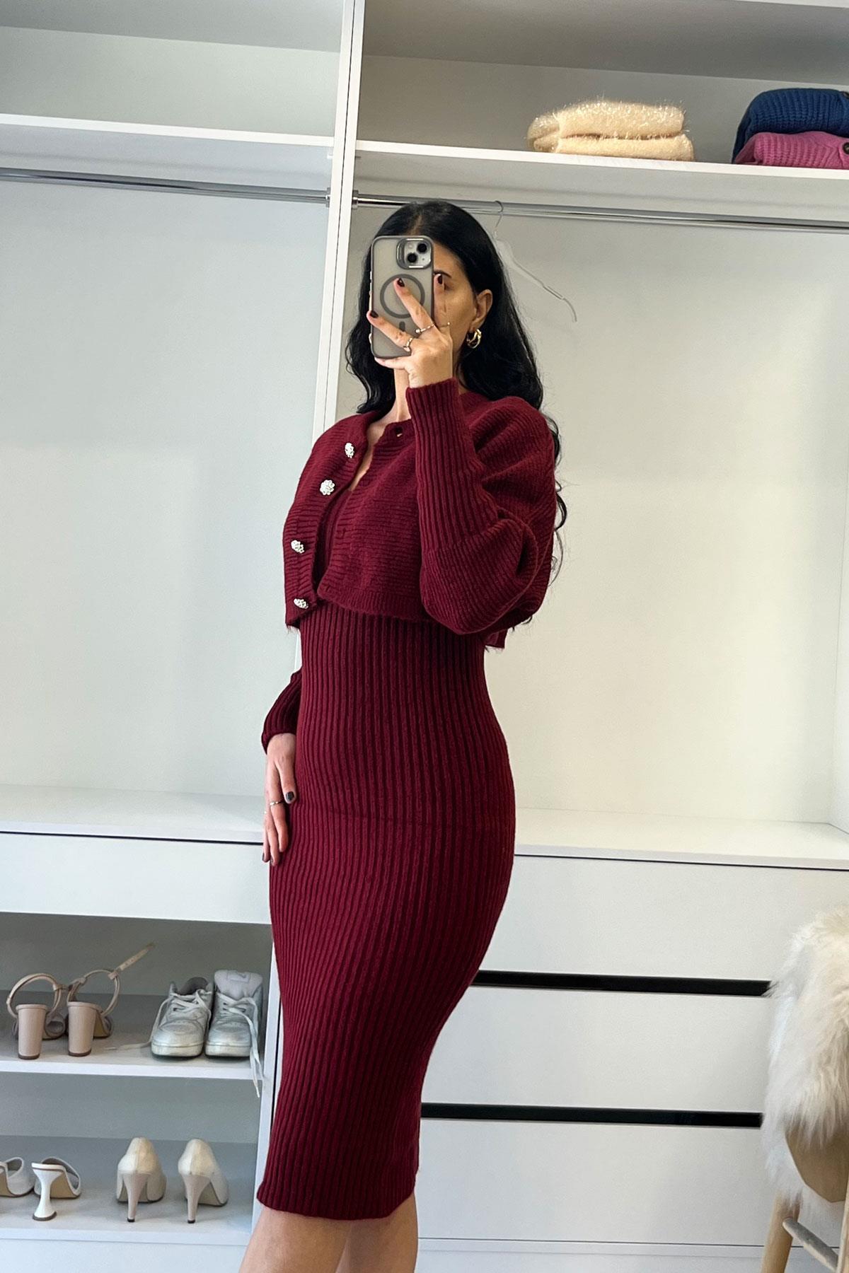 Taş Düğme Detay Kazaklı Triko Takım - Bordo