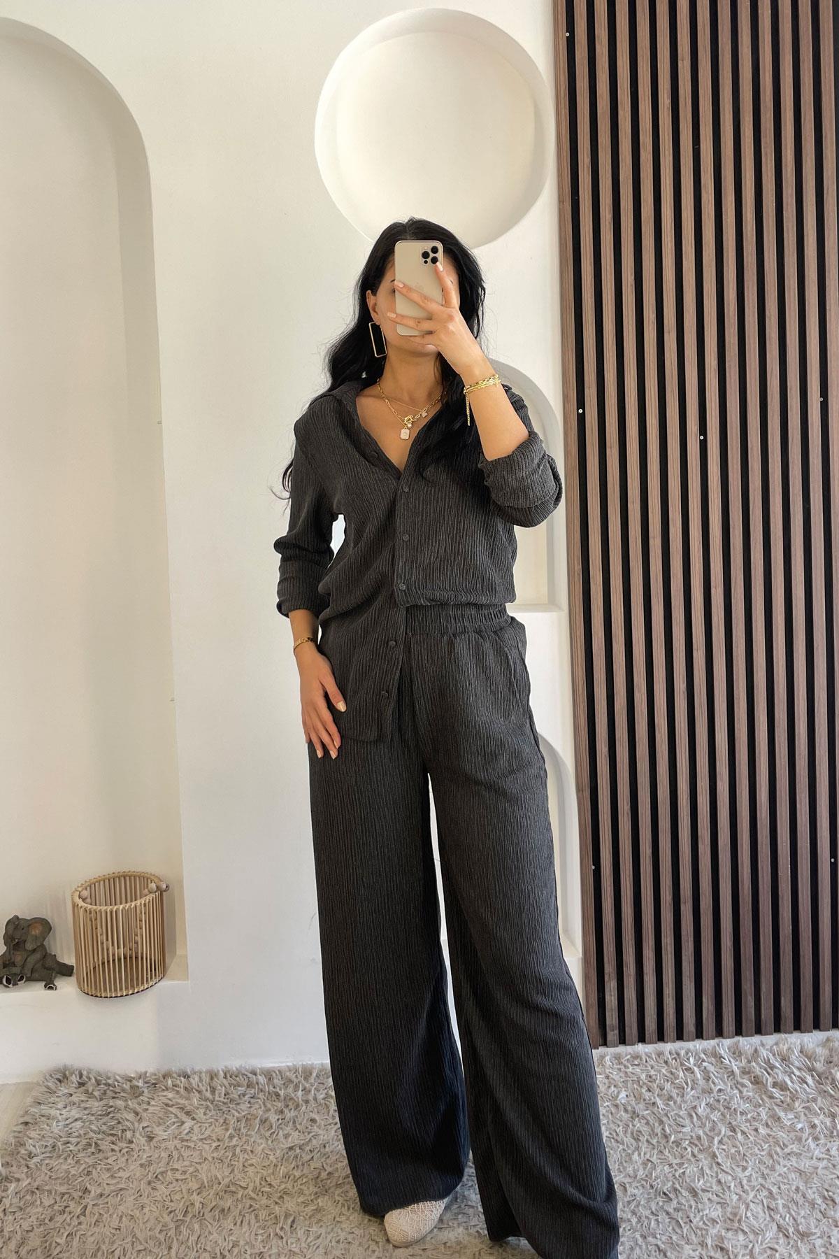 V Yaka Kaplama Düğme Bürümcük Takım - Antrasit
