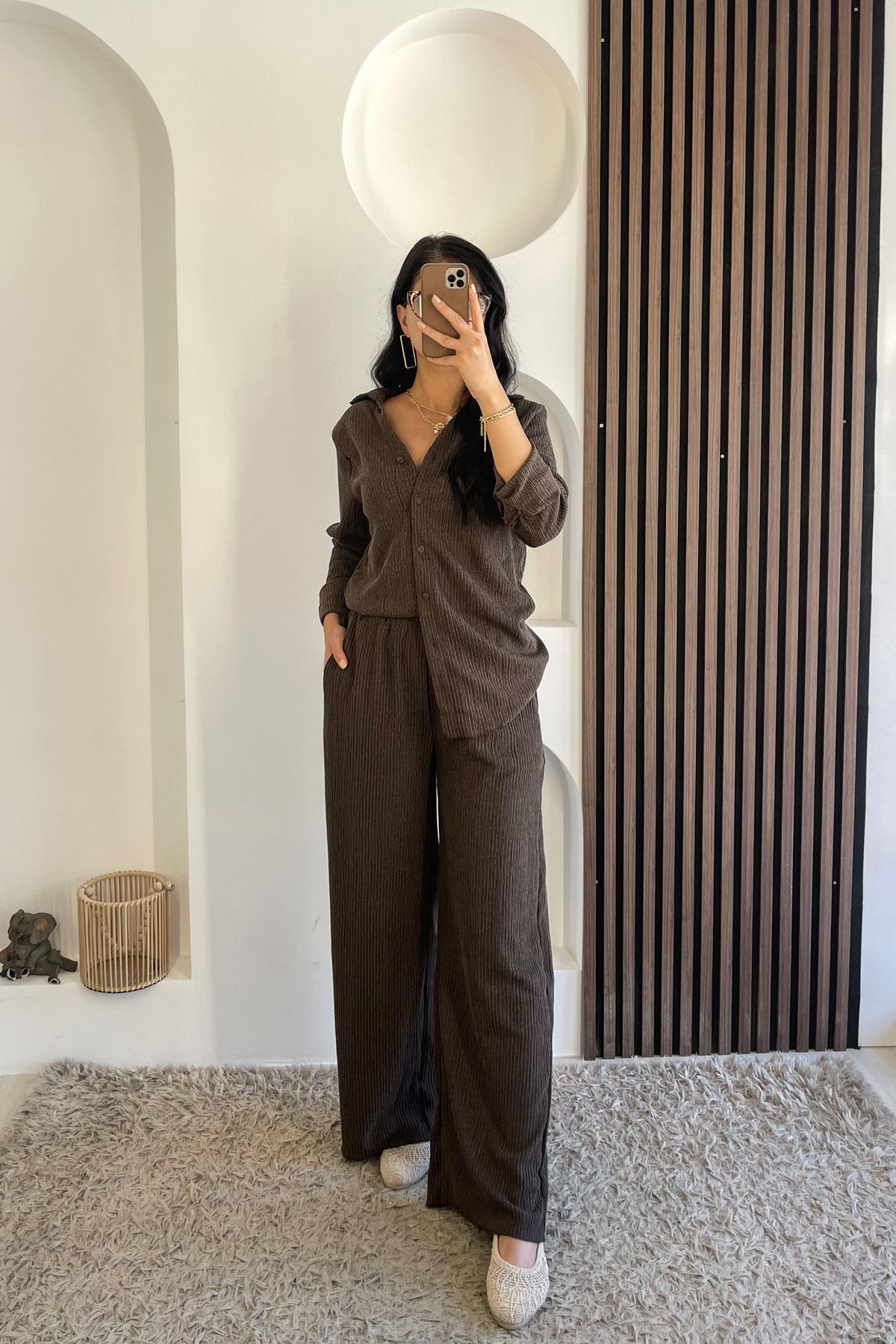 V Yaka Kaplama Düğme Bürümcük Takım - Kahve